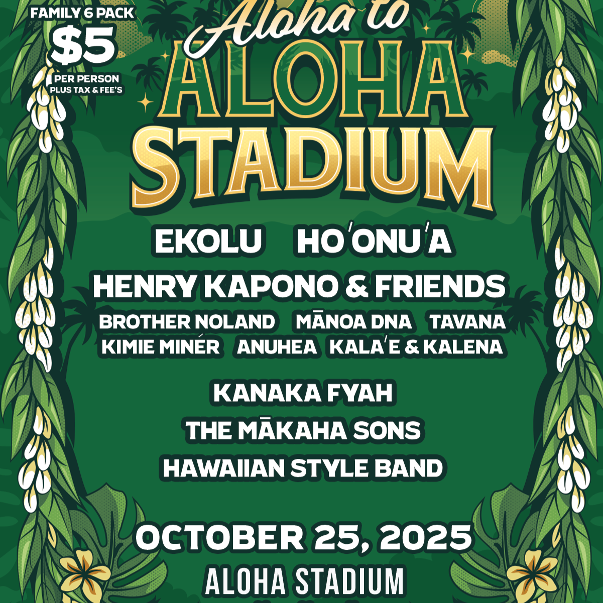 Join us for a farewell celebration of the legendary Aloha Stadium to honor five decades of memories and music. Concert located in the lower stadium parking lot.